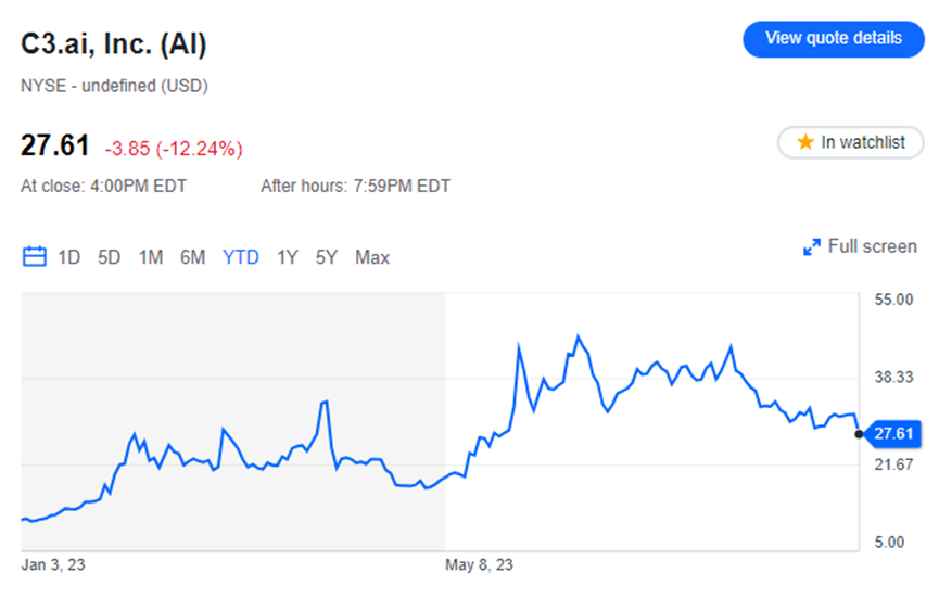 投资者们直接对这份不受欢迎的财报做出了投票。周四,C3.ai股价一度下跌超过15%,收盘时跌幅收窄至12%左右。而在此前,该股票年内一度上涨超过300%,目前仍较年初上涨了近150%。