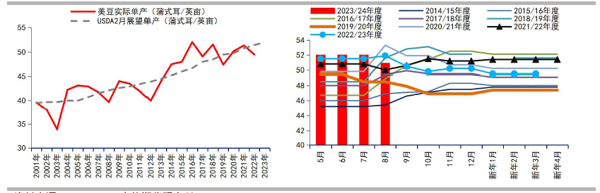 从美豆历史单产数据看,2014年以来美豆单产在47至52蒲/英亩之间波动,而2004年至2013年美豆单产基本在区间40至44蒲/英亩。即在科技进步的驱动下美豆单产水平总体呈现抬升,但短期仍受天气等因素影响而有所波动。2023年以来美豆产区降水偏少,美豆优良率处于同期较低水平。截至9月5日当周,美豆优良率为53%,处于历史同期最低水平。考虑到科技进步的影响,我们对比2014年以来同期美豆优良率和单产变化特征。当前的美豆优良率水平与2019年的9月和10月的优良率最为接近,2019年9月和10月的美豆单产预估分别为47.9蒲/英亩和46.9蒲/英亩,而2019年美豆最终单产为47.4蒲/英亩。因此,从当前美豆优良率和2019年美豆单产水平对比看,USDA9月供需报告或将美豆单产下调至50蒲/英亩及以下。另外,今年ProFarmer经过巡查后预计美豆产量为41.1亿蒲,单产为49.7蒲/英亩,低于2022年作物巡查的51.7蒲/英亩,也低于USDA8月报告预估的50.9蒲/英亩。