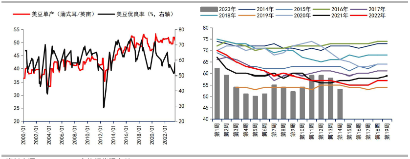 图表3:美豆优良率与美豆单产走势;美豆优良率变化趋势