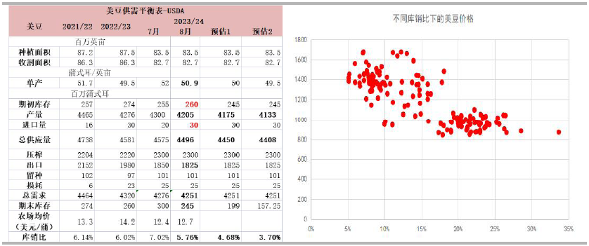 图表4:美豆供需平衡表及不同库销比下的美豆价格