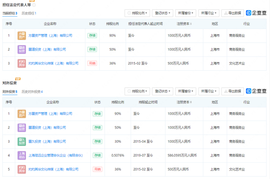 据企查查信息,付宇鹏分别持有方圜资产管理(上海)有限公司(简称:方圜资产)和圜道投资(上海)有限公司(简称:圜道投资)90%和50%的股权,并且是这两家机构的执行董事。其中,圜道投资因2020年-2022年连续三年未依照《企业信息公示暂行条例》第八条规定的期限公示年度报告,出现在经营异常名录中。