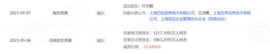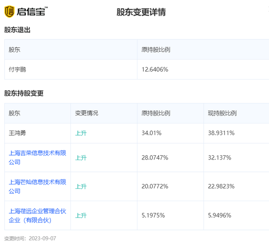 因为这位自然人股东的撤资退出,同为自然人股东的王鸿勇,持股比例从34.01%增至38.9311%;上海吉荣信息技术有限公司(简称:上海吉荣),上海芒灿信息技术有限公司(简称:上海芒灿)和上海荏远企业管理合伙企业(有限合伙)(简称:上海荏远)持股比例相应有所上升。