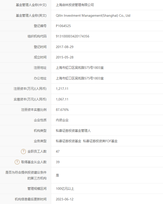 或许因为刚刚发生变更,启林投资在中基协备案的注册资本和股东信息,目前尚未更新。