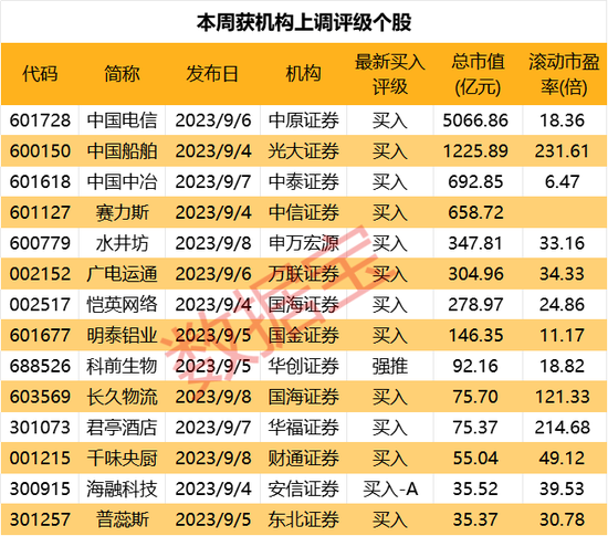 9月4日至8日,机构合计上调14股评级:国海证券上调恺英网络(维权)、长久物流最新评级至“买入”;中信证券上调赛力斯最新评级至“买入”;申万宏源上调水井坊最新评级至“买入”。
