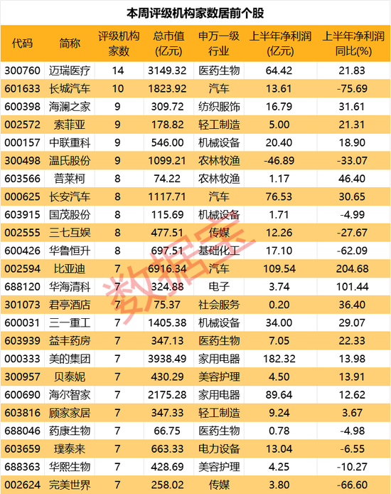 迈瑞医疗、长城汽车本周均获得10次及以上机构评级。