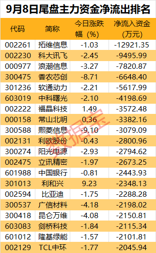 拓维信息是尾盘唯一主力资金净流出超亿元的个股,达到1.29亿元。科大讯飞、浪潮信息、香农芯创尾盘净流出均超5000万元,这些个股都是AI相关的概念股。