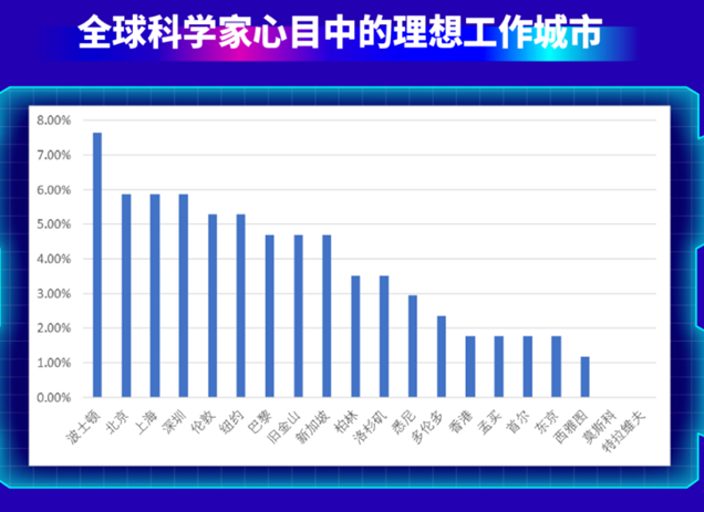 北京、深圳、新加坡分别排名受调查海外科学家计划迁移的首选目标前三位,上海与纽约、波士顿并列第四。这一结果充分体现了北上深对于全球科学家吸引力的实质性提升。