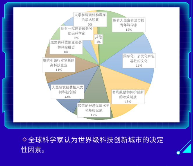 来自全球城市的受调查科学家认为,未来5年至10年将是全球城市科技创新版图调整重构的关键时期。对于全球科技创新领先城市最具重要意义的决定性因素包括城市拥有大量富有创新活力的青年科学家,城市具有国际化、多元化和包容性的创新文化特质,以及政府实施有利于促进创新的体制机制和政策措施。地方政府将在科技创新中心城市的发展中扮演更重要、更积极的角色,利用地方财政公共投资和各种政策工具促进城市科技创新繁荣发展。