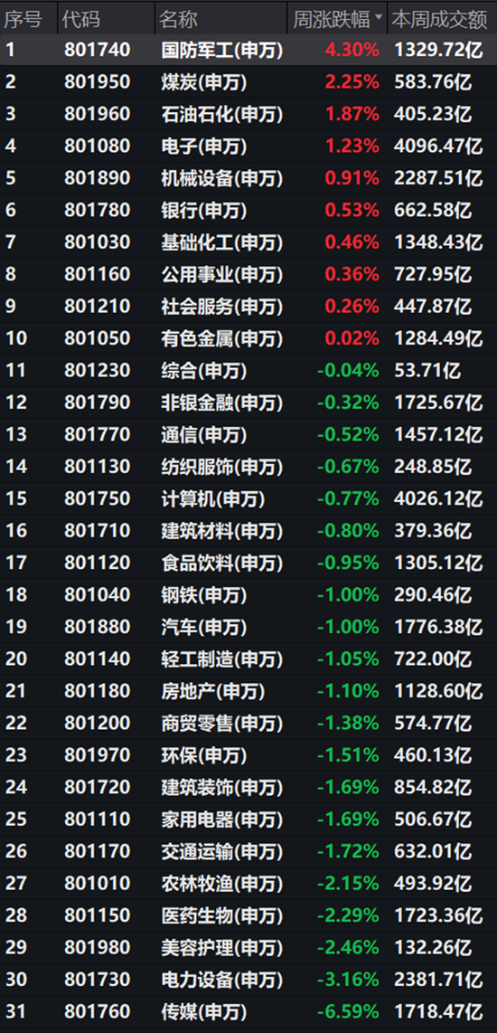 得益于华为概念,上周军工指数涨幅喜人,资源类的煤炭与石化行业上涨也非常明显,但持续性比华为概念要差。传媒和赛道股的行业指数则包揽了跌幅榜。