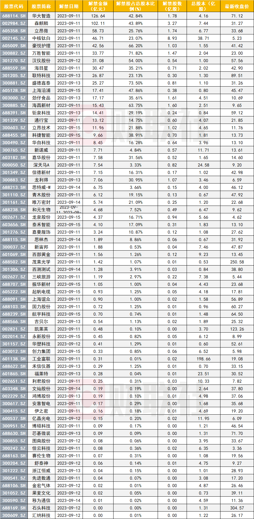 财联社9月9日讯(编辑 魏齐)公开数据显示,下周(9月11日-9月15日)沪深两市共有68家公司限售股陆续解禁,合计实际解禁量33.81亿股,按最新收盘价计算,解禁市值为722.18亿元,其中华大智造、森麒麟、立昂微解禁市值排名前三,分别为126.64亿元、102.11亿元和58.73亿元。