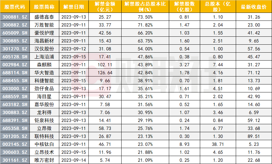 从解禁比例来看,共计5只个股解禁比例占总股本比例超50%,依次分别为:盛德鑫泰(73.50%)、万胜智能(71.82%)、豪悦护理(66.20%)、海昌新材(63.75%)、汉仪股份(54.00%)。