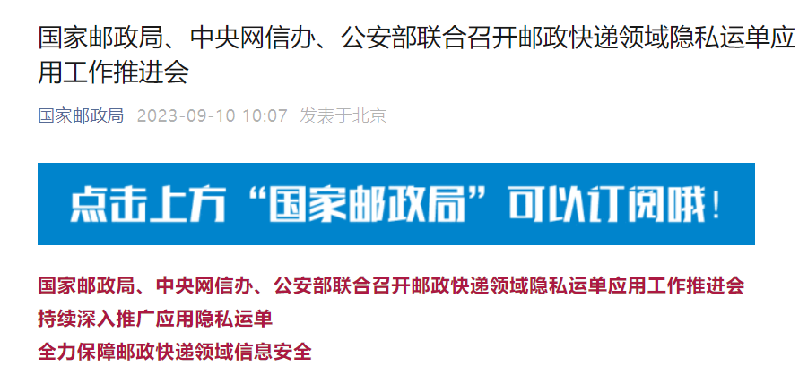 会议强调,推广应用隐私运单是贯彻落实个人信息保护法、保障寄递用户个人信息安全的有效举措,是回应人民群众期待和社会关注的热点问题,是必须要打赢的一场攻坚仗。各部门各企业要提高政治站位,以解决人民群众痛点为己任,迎难而上,积极作为,持续抓好推广应用隐私运单工作,完善制度体系,打通堵点盲区。要增强风险意识,不断升级技术手段,持续完善用户个人信息安全保障措施,加强对从业人员的教育培训,提升从业人员保护用户信息的能力。要坚持问题导向,在不影响寄递服务的前提下,多措并举,有效解决影响末端投递时效、用户体验度打折扣等问题。同时,上下游企业要通力合作,探索实现寄递数据的互联互通,更好满足寄递用户个人信息保护需求。