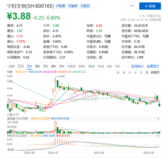 截至9月8日收盘,宁科生物股价为3.88元/股,当日大跌5.6%,总市值仅余27亿元。