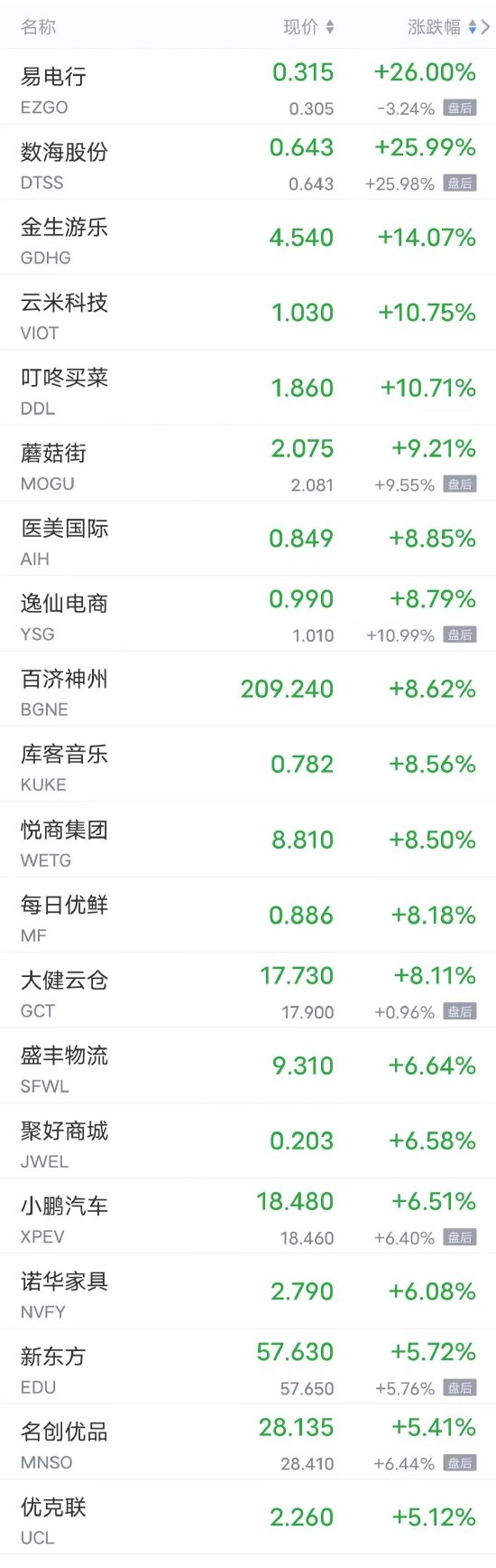 易电行涨超26%,数海股份涨超25%,金生游乐涨超11%,云米科技,叮咚买菜涨超10%,蘑菇街涨超9%,逸仙电商,百济神州,悦商集团,每日优鲜,大健云仓涨超8%,盛丰物流,聚好商城,小鹏汽车,诺华家具涨超6%,新东方,库客音乐,名创优品,优克联涨超5%,百家云,百世集团,满帮涨超4%,泰和诚医疗,房多多,UT斯达康,中进医疗,JYD,优客工场,哔哩哔哩等涨超3%。