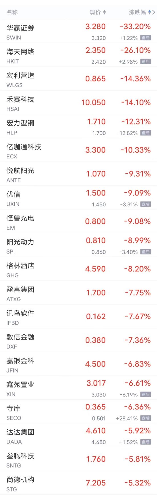 华赢证券跌超33%,海天网络跌超26%,宏利营造,禾赛科技跌超14%,宏力型钢跌超12%,亿咖通科技跌超10%,悦航阳光,优信,怪兽充电跌超9%,阳光动力,格林酒店跌超8%,盈喜集团,讯鸟软件,敦信金融跌超7%,嘉银金科,鑫苑置业,寺库跌超6%,达达集团,叁腾科技,尚德机构,一起教育,海川证券等跌超5%,华迪国际,波奇宠物,中北能,盐港明珠等跌超4%。