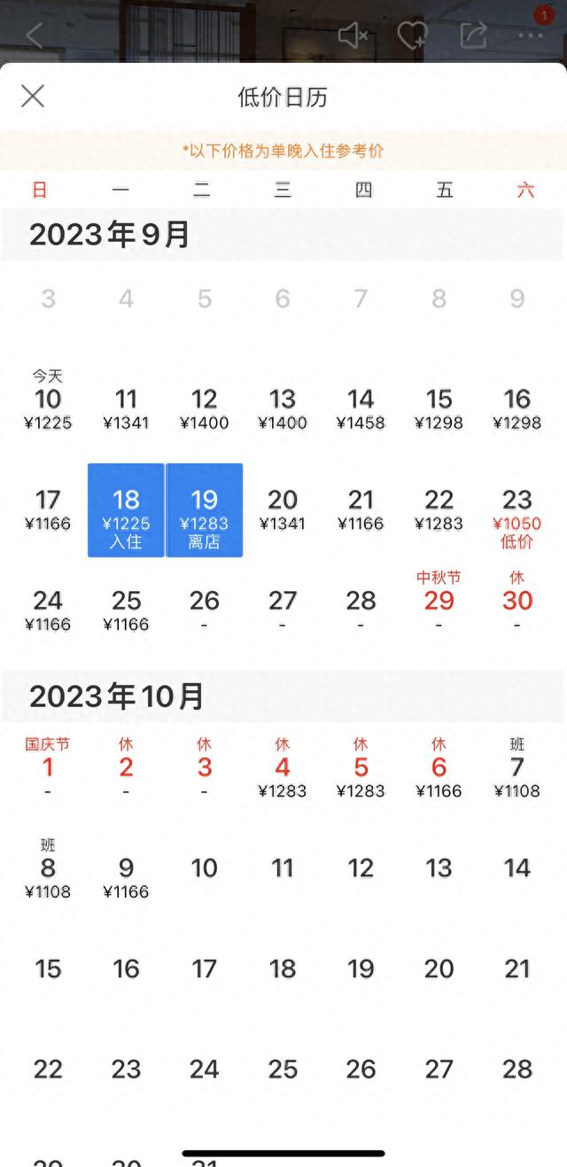 而距离西安大唐不夜城步行距离小于100米的某中端酒店平日最低价格为420元,9月29日入住的最低价格为1371元/晚,是平日价格的3.26倍;9月30日入住的最低价格为1469元/晚,是平日价格的3.5倍;10月1日和10月2日入住的最低价格达1665元/晚,是平日价格的3.96倍。