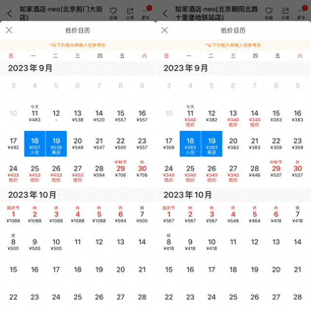 以如家酒店·neo为例,位于中国国家博物馆附近的如家酒店·neo北京前门大街店平日最低价为453元/晚,10月1日至10月5日期间入住的最低房价为1088元/晚,为平日价格的2.4倍。位于北京东四环外的如家酒店·neo北京朝阳北路十里堡地铁站店平日最低价格为340元/晚,10月1日至3日入住的最低房价为567元/晚,为平日价格的1.66倍。