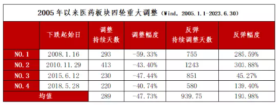 l 看图说话:2005年以来,医药板块共出现过四轮大级别调整,调整幅度均在-40%以上,其中2008年那轮的跌幅更是达-59%。