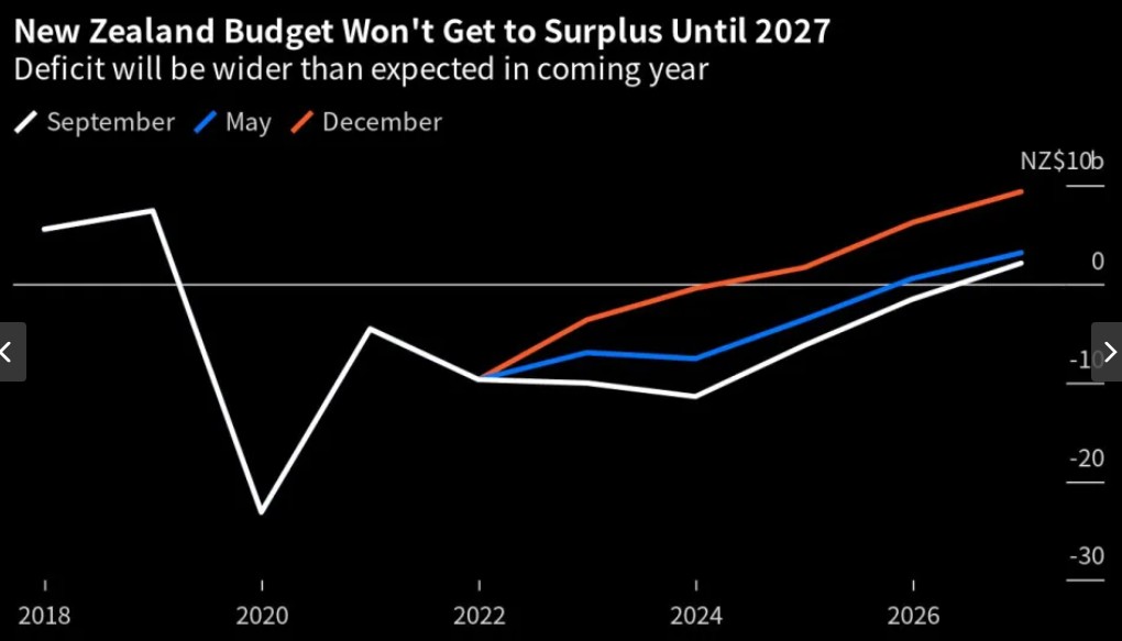 新西兰政府税收收入也减少。今天的文件显示,截至2023年6月的财政赤字暂时为100亿新西兰元,而5月份的预算预测为70亿新西兰元。税收比5月份的预期减少了29亿新西兰元,到2024年6月的收入将达16亿新西兰元,比四个月前的预期少。