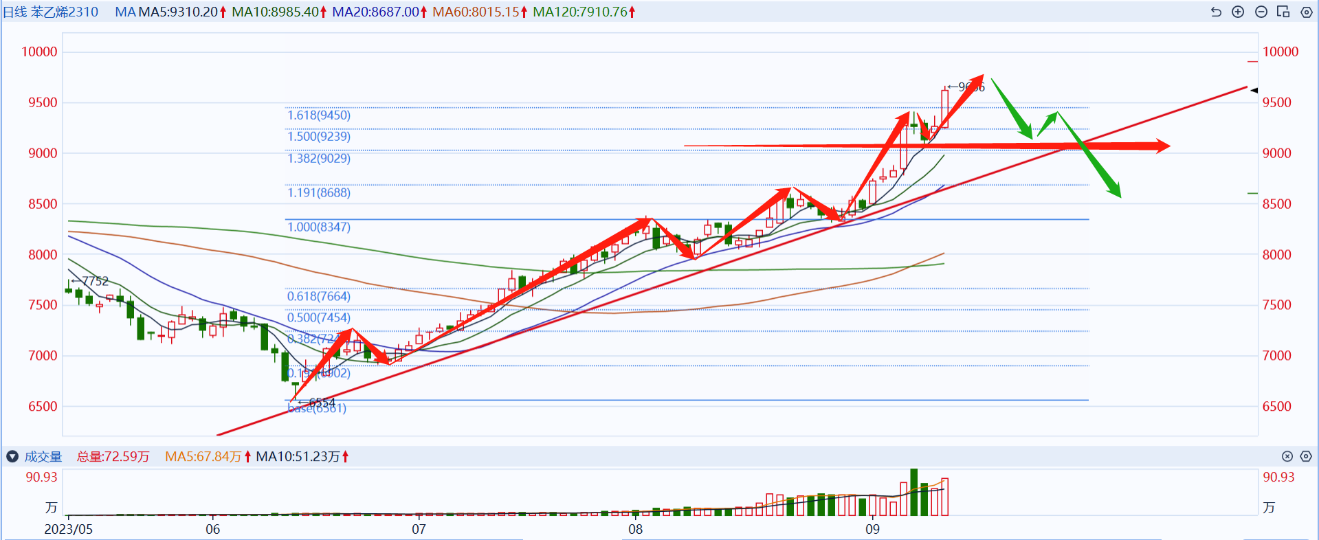 苯乙烯在日线级别时间变盘的影响下并未形成完整的头部形态,10 合约即将步入交割月,在成本端传导持续加速,叠加美元指数走强带来的影响下,行情再度加速破高,短期存在逼仓概率,行情的头部回踩机会从时间周期上来看大概率会发生在本周末下周初的周度变盘周期,短期来看近月维持震荡偏强思路,短线操作建议回调黄金分割 150%分位区域附近支撑区域企稳,适度参与低吸,谨慎追多。