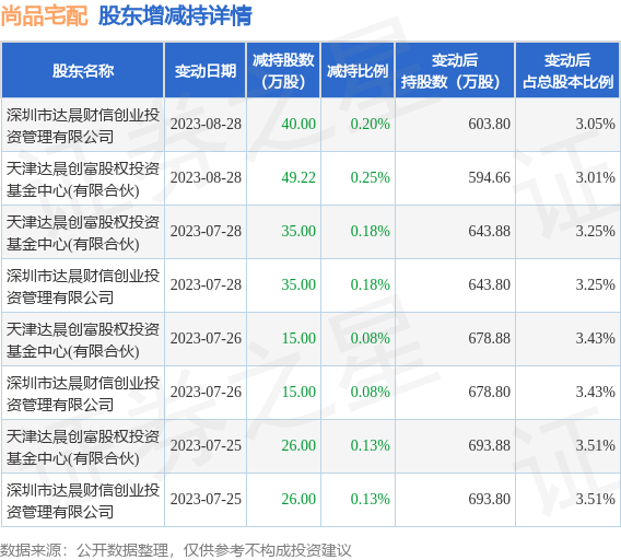 9月12日尚品宅配发布公告《尚品宅配:关于持股5%以上股东权益变动超过1%的公告》,其股东深圳市达晨财信创业投资管理有限公司、天津达晨创富股权投资基金中心(有限合伙)于2023年7月25日至2023年8月28日间合计减持241.22万股,占公司目前总股本的1.2192%,变动期间该股股价下跌4.55%,截止8月28日收盘报18.88元。