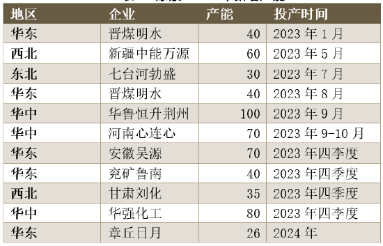 展望后市,供应方面,产量同比持续增加,环比有望下降。从产能周期上看,目前处于增产周期。从2023年投产计划来看,年内新增产能超过400万吨,上半年已经投产产能达100万吨,水煤浆工艺为主,3季度还有240万吨产能计划投产,水煤浆工艺为主,重要时点在3季度中和年底。