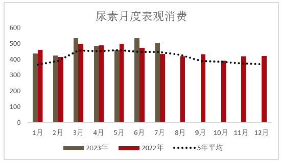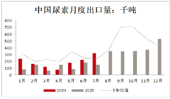 2021年10月15日,尿素出口由商检改为法检,尿素从当年9月出口109万吨,快速下降到当年12月3.5万吨。2022年国内尿素大单出口依然受到严格管控,仅部分援助出口。在内外价差一度上千的2022年,实际出口按季度增加,1 季度月均 10 万吨,2 季度月均 15 万吨,3 季度月均 30 万吨,4季度月均42万吨,政策因子与实际出口相关性持续下降。截止到2023年7月,1-7月出口133万吨,同比增加52.53%。