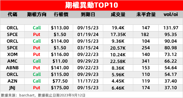 1、甲骨文:股价暴跌后获期权大单抄底,其行权价分别为113美元、114美元的末日Call单,以及行权价115美元、9月29日到期的Call单出现巨量成交,抄底资金押注该股超跌反弹。