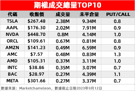 1、苹果:隔夜股价收跌近2%,公司推出iphone15系列产品亮点未达市场预期,瑞银随即下调该机型销量预测。隔夜苹果期权成交量激增至202万张,较前一交易日翻倍,其中Call单占比58%。苹果近五个交易日大跌7%,期权投资者倾向于逢低买入,过去五天该股Call单持仓量增加了9.1%。