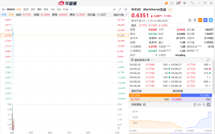 电动卡车和送货无人机制造商Workhorse $WKHS 美股盘前大涨21.26%,报0.77美元。Workhorse获美国财政部下辖国税局(IRS)批准,公司将享受商用清洁车辆信贷政策,客户购车可最高享受4万美元。