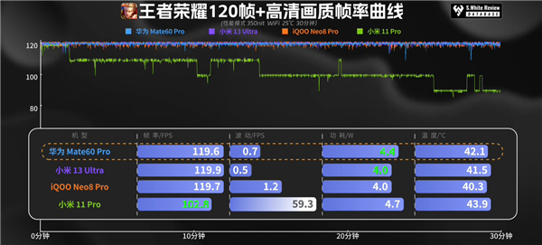 不过该UP主强调,华为Mate 60 Pro的优化是超预期的,游戏实测华为Mate 60 Pro玩《王者荣耀》120帧+高清画质模式,全程帧率保持在120帧左右,不会出现骁龙888机型的掉帧,而且功耗更低。