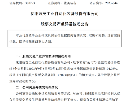 9月13晚间,蓝英装备披露股票交易严重异常波动公告称,未发现近期公共传媒有报道可能或已经对公司股票交易价格产生较大影响的未公开重大信息;近期公司经营情况及内外部经营环境未发生重大变化;公司、控股股东和实际控制人不存在关于本公司的应披露而未披露的重大事项,或处于筹划阶段的重大事项;在公司股票交易严重异常波动期间,控股股东、实际控制人未买卖公司股票。