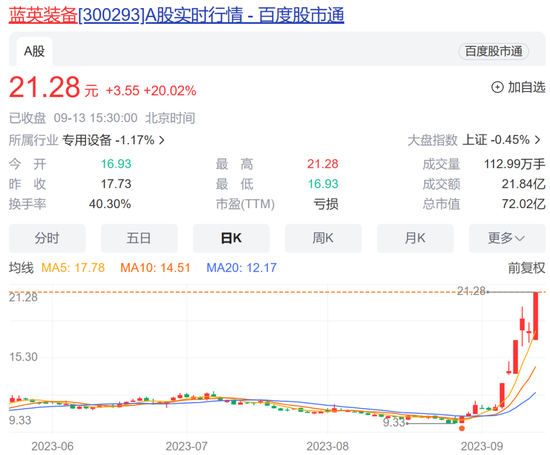 当日,蓝英装备报收于21.28元,涨跌幅20.02%,换手率40.30%,成交额21.84亿元。