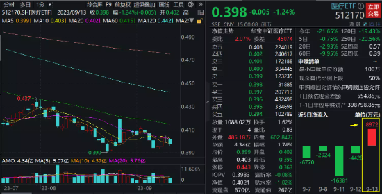 二级市场方面,9月13日医疗板块随市下行,板块头部医疗ETF(512170)场内价格再度跌破0.4元,最新数据显示,当日有近9000万元资金逢跌增仓,医疗ETF(512170)资金动向由流出转为流入。