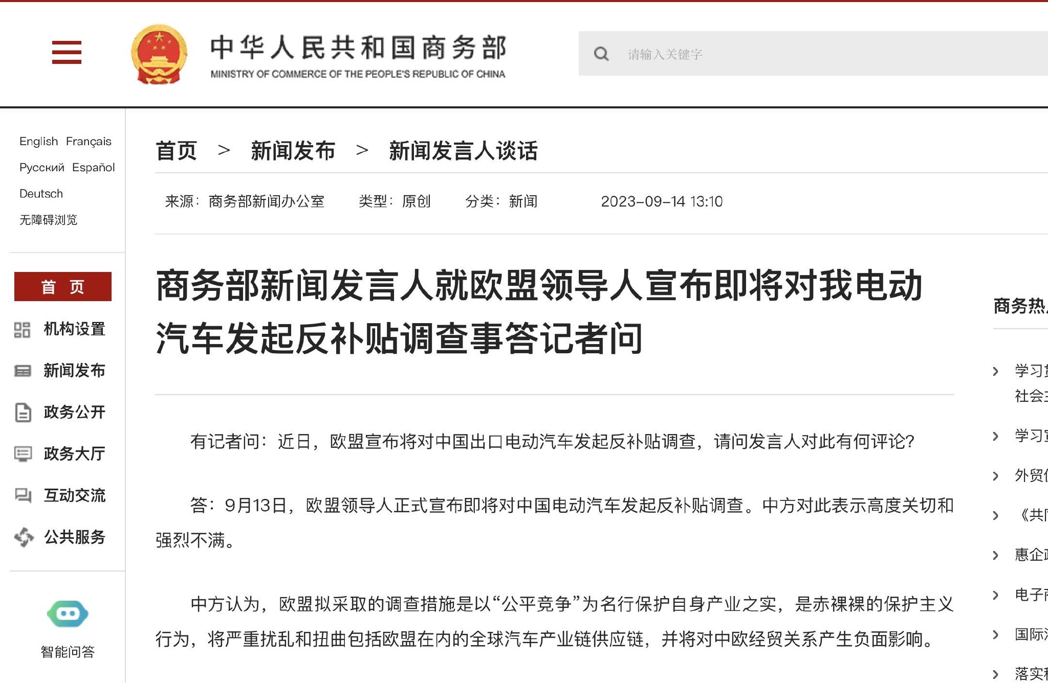 商务部网站消息,9月14日,商务部新闻发言人就欧盟领导人宣布即将对我电动汽车发起反补贴调查事答记者问。