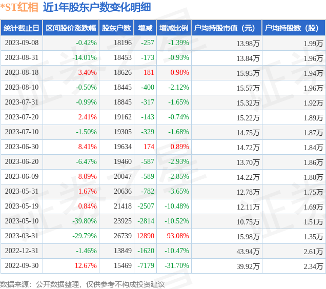 从股价来看,2023年8月31日至2023年9月8日,*ST红相区间跌幅为0.42%,在此期间股东户数减少257.0户,减幅为1.39%。