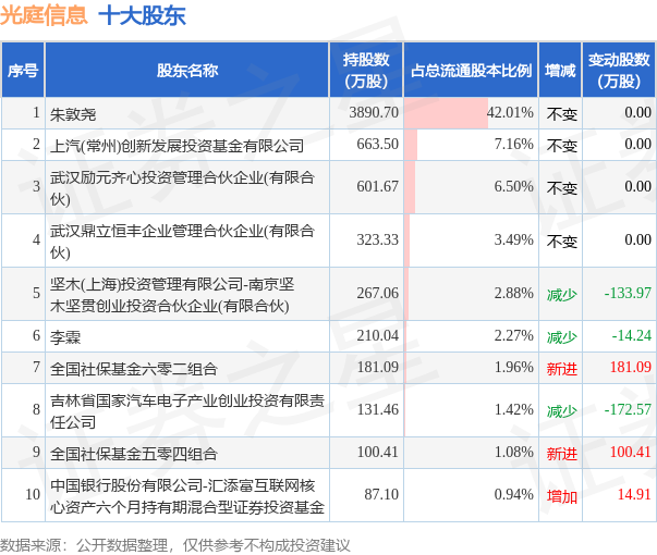 根据光庭信息2023年中报公布的十大股东详情如下: