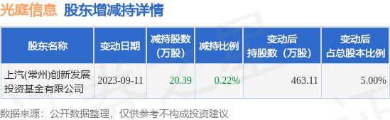 9月14日光庭信息发布公告《光庭信息:关于股东权益变动的提示性公告》,其股东上汽(常州)创新发展投资基金有限公司于2023年9月11日合计减持20.39万股,占公司目前总股本的0.2201%,变动期间该股股价上涨10.77%,截止9月11日收盘报69.4元。