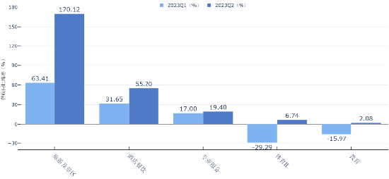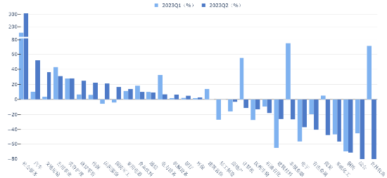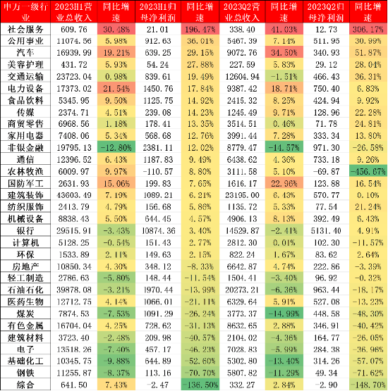 归母净利润: 2023H1社会服务、公用事业、汽车及美容护理同比增速较快,分别为:196.47%、36.01%、29.15%、27.88%。