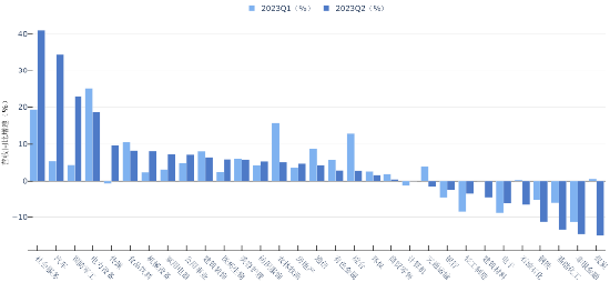 分季度来看,2023Q2,社会服务、汽车、国防军工营收同比增速扩大,其中社会服务受疫情修复及2022同期低基数影响,2023Q2营收增速由19.35%增长到41.03%,电力设备、食品饮料营收增速收窄,石油石化、基础化工、钢铁、煤炭等周期性行业营收下滑幅度扩大。社会服务、汽车、交通运输归母净利润同比增速持续扩大,其中社会服务2023Q2归母净利润同比增速由153.06%增长到306.17%,电力设备增速收窄。