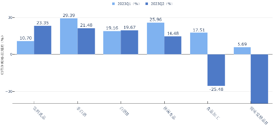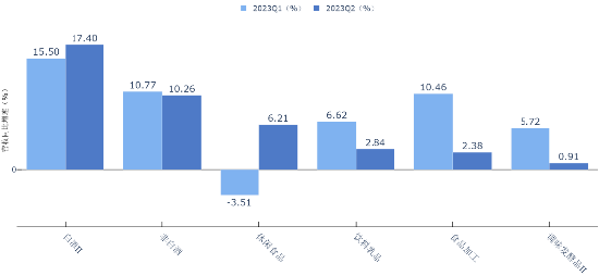 分季度来看,2023Q2,白酒II、休闲食品营收同比增速大幅上涨,其中,休闲食品由2023Q1的-3.51%增长到6.21%,营收同比增速转正。2023Q2,饮料乳品、白酒II归母净利润同比增速上涨,其中饮料乳品由2023Q1的10.7%增长到23.35%。