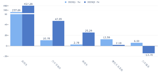 分季度来看,2023Q2,商用车、乘用车、汽车零部件营收同比增速大幅上涨,其中,乘用车由2023Q1的4.74%增长到44.53%,汽车服务营收同比增速转正。2023Q2,商用车、汽车零部件、乘用车归母净利润同比增速大幅上涨,其中乘用车由2023Q1的2.78%增长到25.29%。