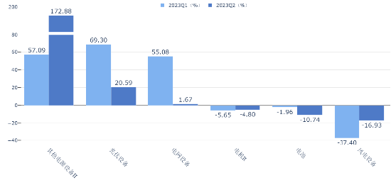 分季度来看,2023Q2,其他电源设备II(变压器、稳压器等)、风电设备营收同比增速大幅上涨,其中,其他电源设备II由2023Q1的4.63%增长到26.09%,风电设备营收同比增速转正,光伏设备、电池及电网设备营收同比增速均出现一定程度下滑。2023Q2,其他电源设备II归母净利润同比增速大幅上涨,由2023Q1的57.09%增长到172.88%,风电设备归母净利润下跌幅度同比收窄,光伏设备、电池、电网归母净利润同比增速出现下跌。