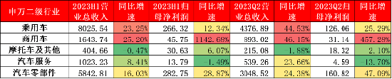图表 18:2023H1汽车行业下申万二级行业业绩(单位:亿元)