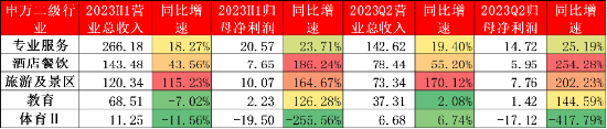 2023年开年以来,国民经济各项活动逐步恢复正常,2023H1社会服务营收同比上涨30.48%,归母净利润同比大幅上涨196.47%,表现亮眼。具体来看,社会服务下申万二级行业中,专业服务、酒店餐饮、旅游及景区,营收占比较大,同时,2023H1营收及归母净利润同比均出现上涨,从而推动整个社会服务行业业绩上涨。