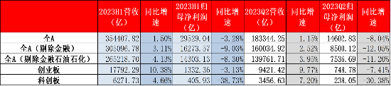 2023年A股上市公司中报已披露完毕,整体来看,全部A股2023H1营收同比增长1.5%,归母净利润同比下降3.28%。分季度来看,2023Q2营收同比增长1.15%,同比增速相较一季度1.88%出现一定程度下滑。2023Q2归母净利润同比下降8.04%,相较于一季度1.87%,增长转负。全部A股剔除金融或金融石油石化后,2023H1营收同比增速分别为3.11%和4.13%,归母净利润同比增速分别为-9.03%和-8.30%,剔除金融或金融石油石化营收同比增速增加,但归母净利润同比下跌幅度扩大。全部A股Q2整体营收同比增速放缓,整体归母净利润同比增速出现下滑。创业板和科创板中,科创板2023Q2营收同比增长7.2%,增速加快,归母净利润同比跌幅收窄,科创板业绩情况出现改善迹象。创业板营收同比增速出现下滑,归母净利润同比增速转负。