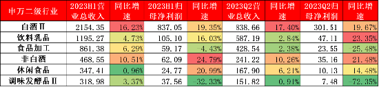 食品饮料:白酒II、饮料乳品、非白酒,营收同比分别增长:16.23%、4.73%、10.51%,归母净利润同比分别增长:19.35%、16.03%、24.79%。