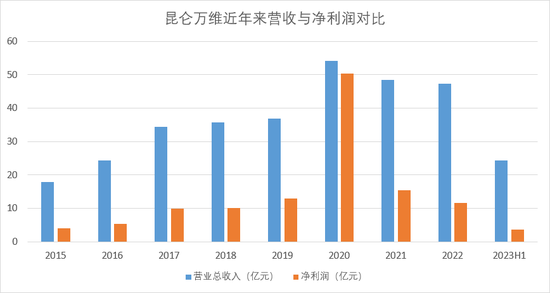 根据财务数据,昆仑万维在2020年创下营收54.2亿元、净利润50.42亿元的高点后,便迈入了下行区间,2022年营收下降至47.36亿元,净利润更是降至11.53亿元。