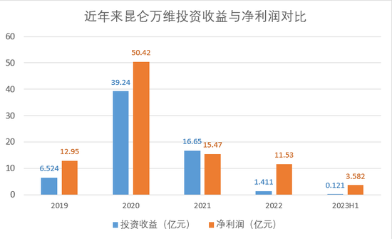 2019年-2022年,昆仑万维的净利润分别为12.95亿元、50.42亿元、15.47亿元、11.53亿元,其中“投资收益”分别为6.52亿元、39.24亿元、16.65亿元以及1.41亿元,占净利润的比例分别达到50.35%、78.1%、107.63%以及12.23%。