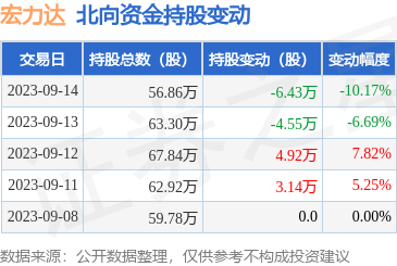 9月14日北向资金减持6.43万股宏力达。近5个交易日中,获北向资金减持的有2天,累计净减持2.92万股。近20个交易日中,获北向资金增持的有9天,累计净增持12.11万股。截至目前,北向资金持有宏力达56.86万股,占公司A股总股本的0.41%。